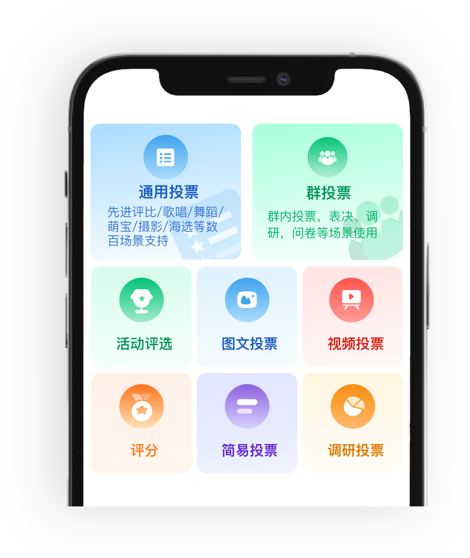 支持视频投票、图片投票、群投票、调研投票、评分等众多功能,满足99%投票场景